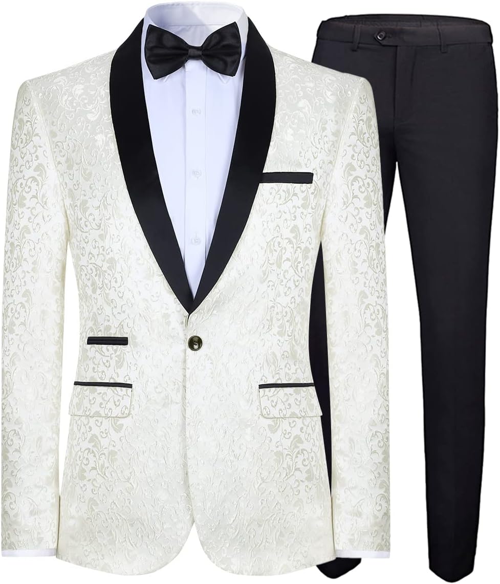 - [DESIGN]: Top – Elegant suit blazer with black shawl collar, center vent, one chest pocket, two inner pockets and two side flap pockets, featuring exquisite floral print, 3D tailored fit cut and full shoulder design, overall nice expressing a sharp looking; Bottom – Flat front trousers with two side slant pockets and two back pockets