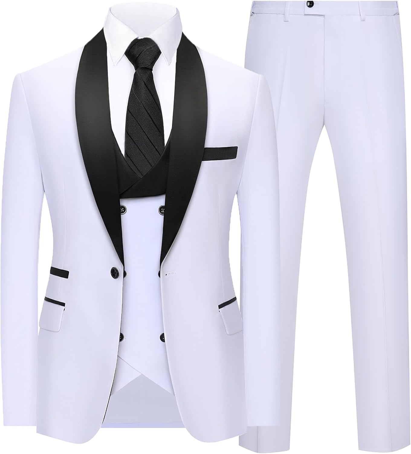 - 3 PIECE SUIT SET – The stylish suit set features a one-button jacket, a vest and slim fit men’s suit pants. JACKET : Shawl lapel, 2 front flap pockets, 1 ticket pocket, 1 chest slip pocket, 3 interior pockets, Side vents, Fully lined. Vest: Shawl Lapel, Double Breasted 3 Buttons. PANTS : Flat front, Front slash back welt pockets, Adjustable waist, 2 back button pockets, 2 side slip pockets.