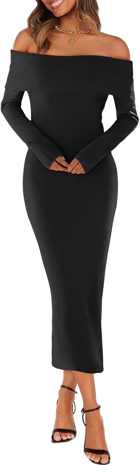 - Features: The cute dress features long sleeves, off the shoulder neckline, stretchy ribbed knit, about calf or maxi length, solid color, and bodycon style. A trendy wedding guest dress, engagement dress, maternity dress, sexy dress, going out dress, dress for women casual spring